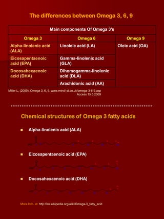 The document discusses omega-3, omega-6, and omega-9 fatty acids, including their main components, plant and seafood sources, functions in the body, role in various health conditions, and deficiency symptoms. It provides details on the differences between plant and marine sources of omega-3s, how omega-3s function in the body including promoting healthy cell membranes and reducing inflammation, and conditions such as cardiovascular disease and depression that omega-3s may help prevent or treat.