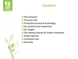 Omega Bázis produces healthy foods using a patented high-sprouting technology. The technology removes barriers in flax seeds that normally prevent human digestion, allowing the seeds to be consumed. Products include ground and flour items with high fiber, protein and omega-3 fatty acids. The company aims to improve public health and sees opportunities in diabetes, cancer and heart disease treatment markets through functional foods. Further investment of around $1.2 million could expand production capacity five-fold.