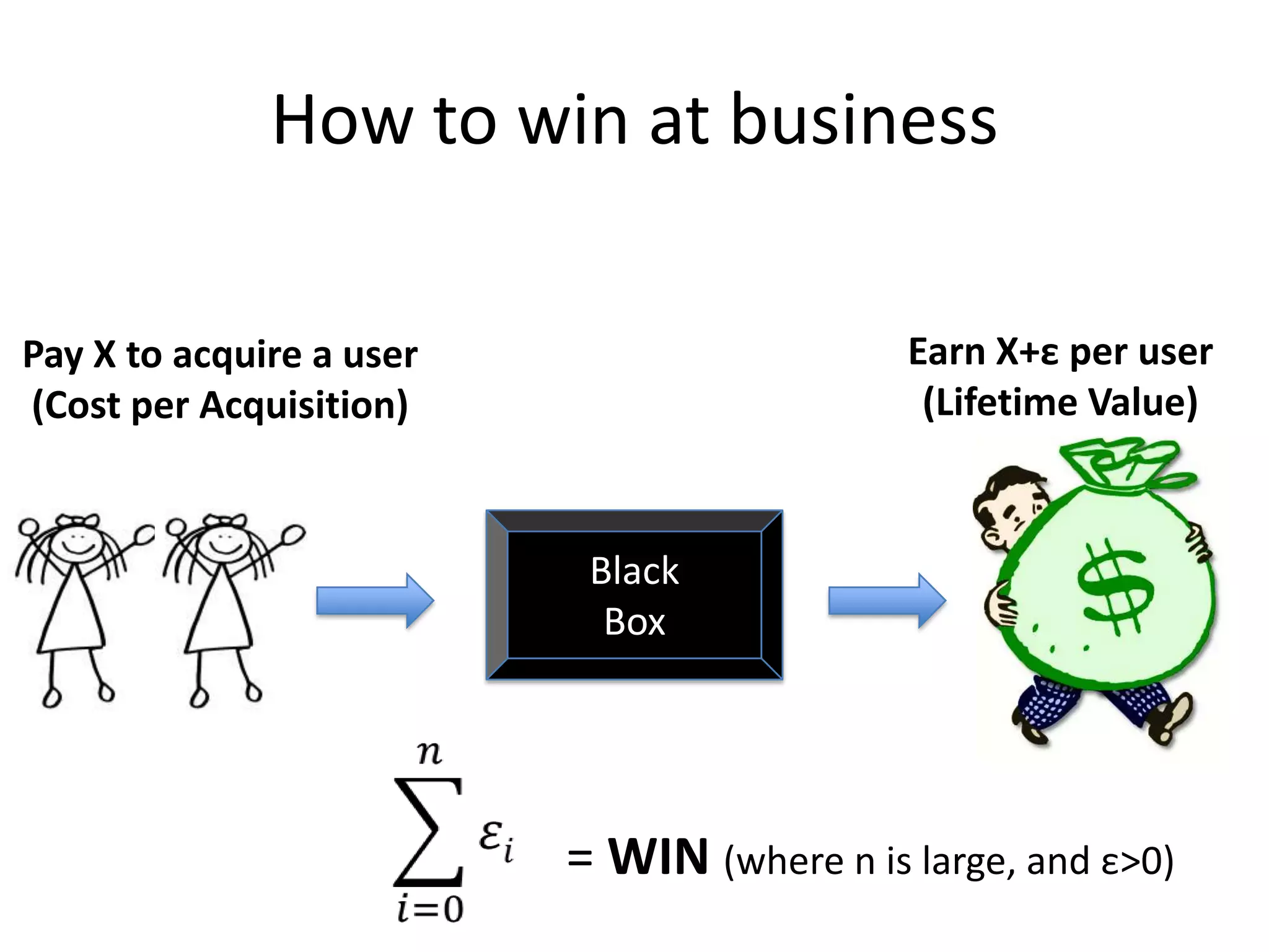 - The document discusses how to use predictive analytics and A/B testing to increase user conversion and revenue for a gaming startup.