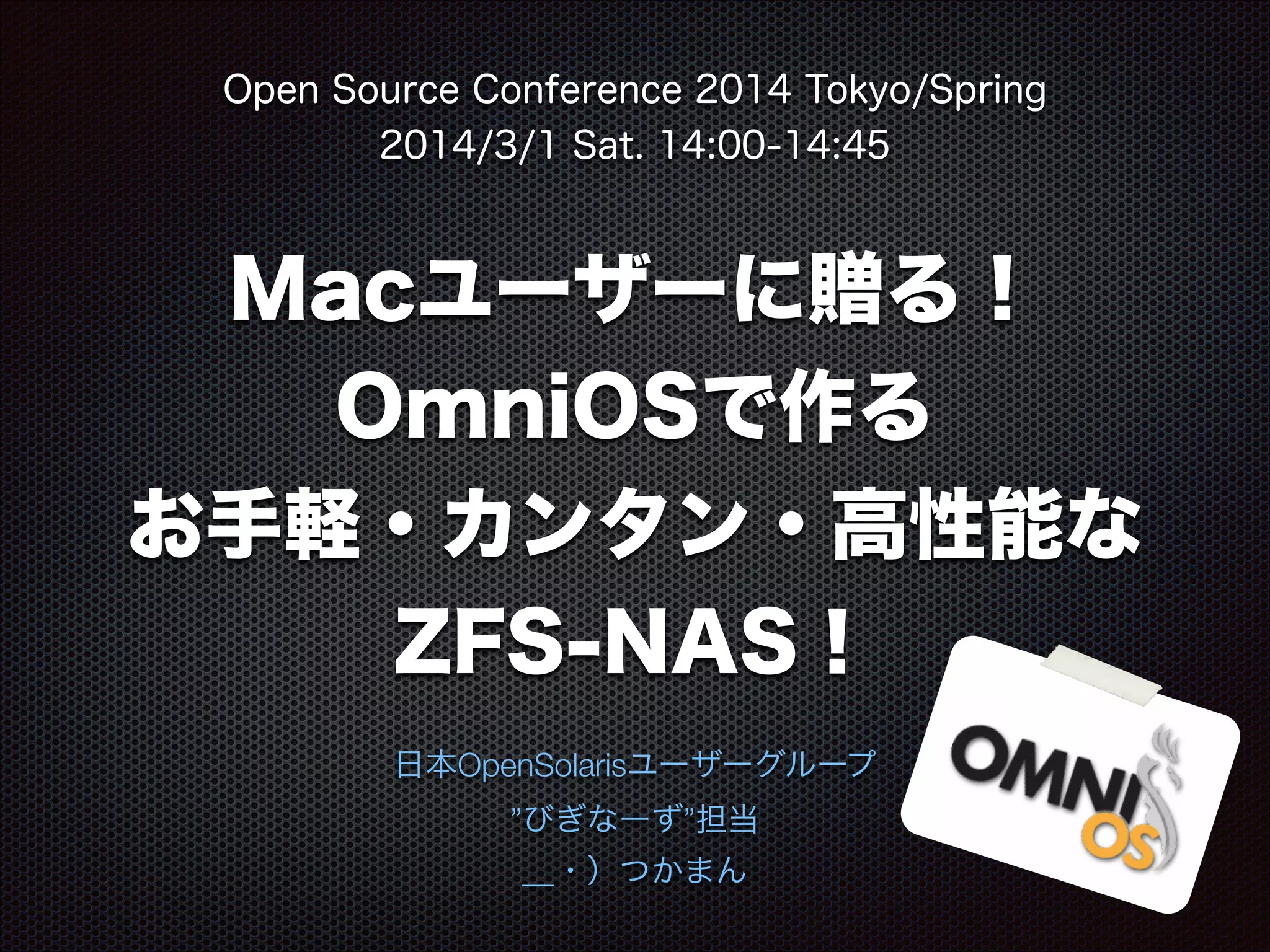 OSC 2014 Tokyo/Springの日本OpenSolarisユーザーグループセミナー枠での資料です。 ZFSベースのAFP-NASの作り方を説明しています。Netatalk の3.1.0を利用しています。 とっても簡単に作れてしまうので、Time Machine用のNASを探している人は是非チャレンジしてみてください。 2014/2/27追記: 一部の内容を修正(インストールするパッケージの追加と不要な設定の削除)しました。