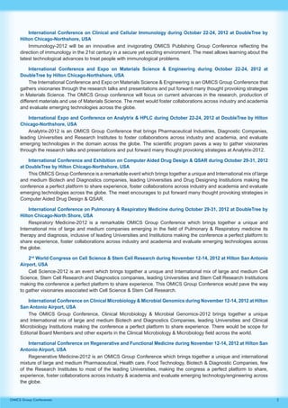 Omics Publishing Group organizes a series of conferences that connect professionals from various scientific disciplines to share knowledge and foster collaboration. These events feature presentations, panel discussions, and networking opportunities covering a wide range of topics in life sciences, chemical sciences, and more. The conferences aim to enhance professional interactions and support advancements in research and technology through collaboration between academia and industry.