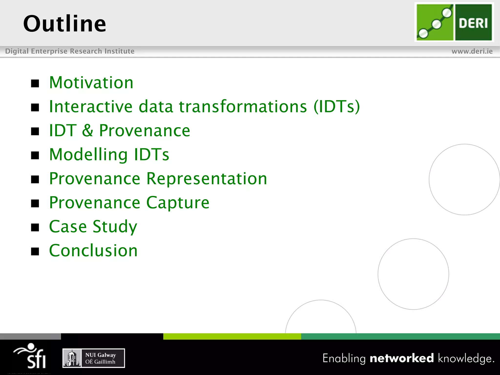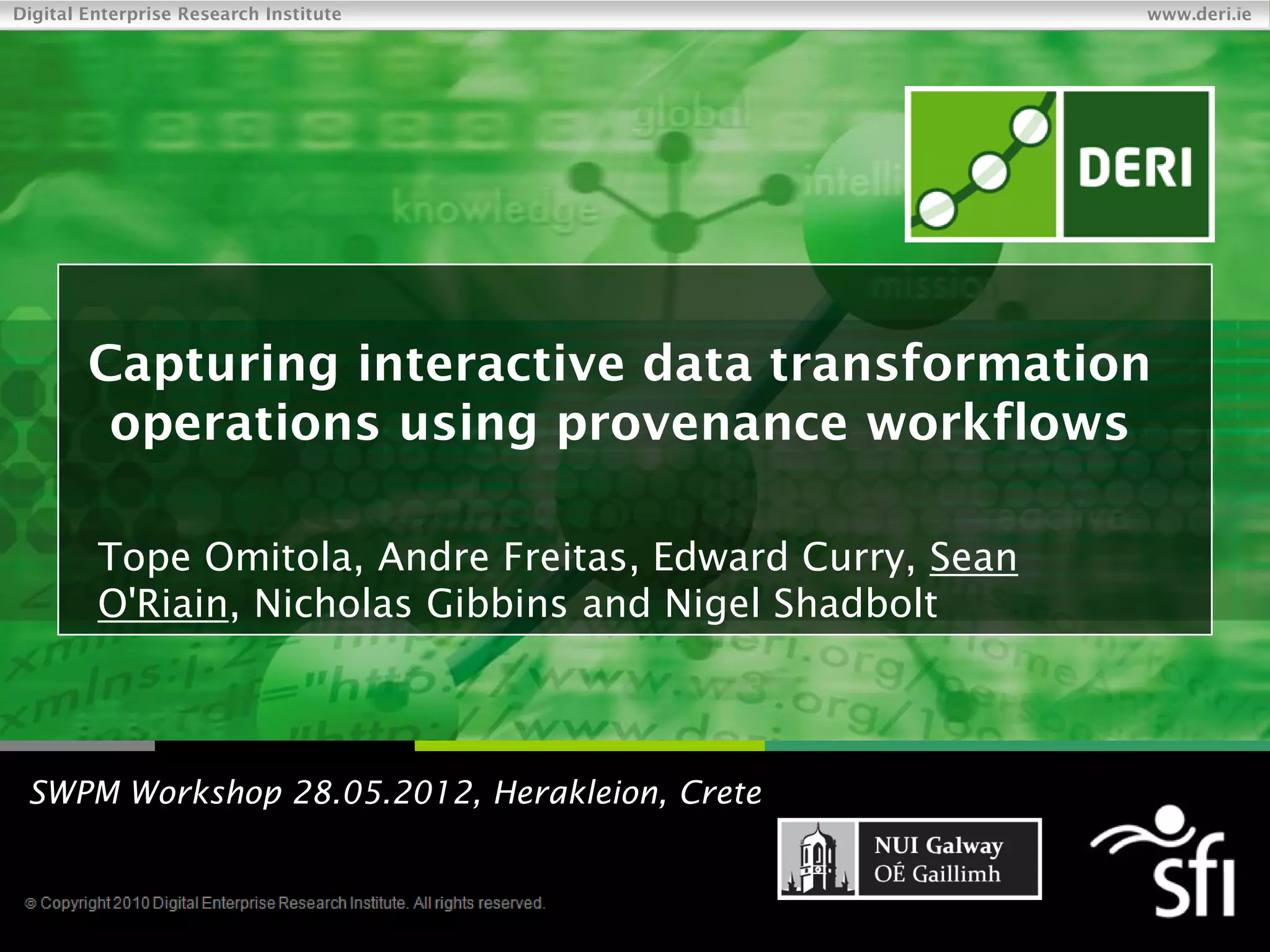 This document discusses capturing interactive data transformations using provenance workflows. It presents a model for interactive data transformations (IDTs) involving user interactions. Challenges include representing IDTs and facilitating reuse. The approach models IDTs and represents provenance using the Open Provenance Model. It describes capturing provenance for IDTs during interactive sessions to provide transparency into the transformation process. A case study demonstrates implementing provenance for an IDT tool based on the Google Refine platform.