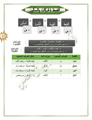 يتناول الوثيقة دراسة أنواع الحروف المدودة في اللغة العربية وموضوعات متعلقة بالمقاطع الصوتية وتركيب الكلمات. تشمل الأمثلة الكلمات ذات الحروف المدودة مثل الألف والواو والياء، وتدريبات على تقطيع الكلمات وتحديد أنواع المد. كما يتم تقديم تمارين لتحديد المد وتصحيح الأخطاء.