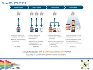 The document discusses the concept of omni-channel retail, emphasizing the importance of a seamless customer experience across all channels to enhance brand loyalty and sales. It highlights various strategies such as personalized marketing, mobile interaction, and consumer engagement techniques that lead to increased consumer spending. Additionally, it outlines challenges faced by businesses in implementing omni-channel strategies and provides examples of companies successfully utilizing these techniques.
