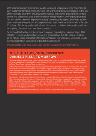 The document discusses the need for companies to shift towards providing an omni-experience for customers by delivering seamless experiences across channels and giving customers control over customizing products and services. It states that by 2018, 20% of industry leaders will allow for this level of customization. Delivering an omni-experience requires deep digital transformation across the entire organization through collaboration between business and IT leaders. The document examines how to succeed in omni-experience transformation.