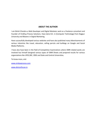 This document provides information about OMR sheets, including what they are, how they are designed and scanned, and instructions for filling them out correctly. It describes the basics of OMR sheets, how they are used for objective exams, and software like AutoCAD used to design them. It also outlines different types of OMR sheets, security features, the scanning process, and important guidelines for test-takers around properly filling bubbles and avoiding errors.