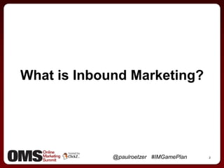 The document outlines a comprehensive inbound marketing game plan presented by Paul Roetzer at the Online Marketing Summit in Milwaukee. It emphasizes the importance of defining a brand, creating a content-driven website, and establishing measurable campaign objectives to achieve leads and loyalty. The document also discusses the integration of various marketing strategies, including search marketing, social media, content marketing, and public relations, to optimize performance using dynamic budgets and analytics.