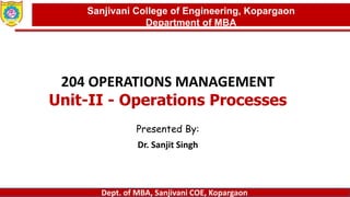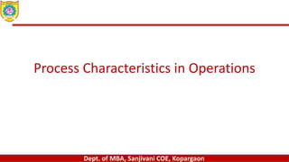 This document discusses various types of operations processes and layouts. It begins by describing factors that influence process choices such as volume, variety, and flow. The three types of flows are defined as continuous, intermittent, and jumbled. Examples are given for each type of flow and industry. Process layouts, product layouts, group technology layouts, and fixed position layouts are also described along with their pros and cons. The relationship between volume, variety, and flow and appropriate layout choices is also discussed.