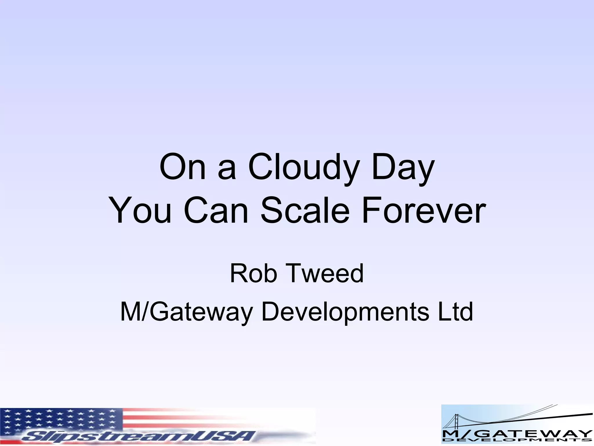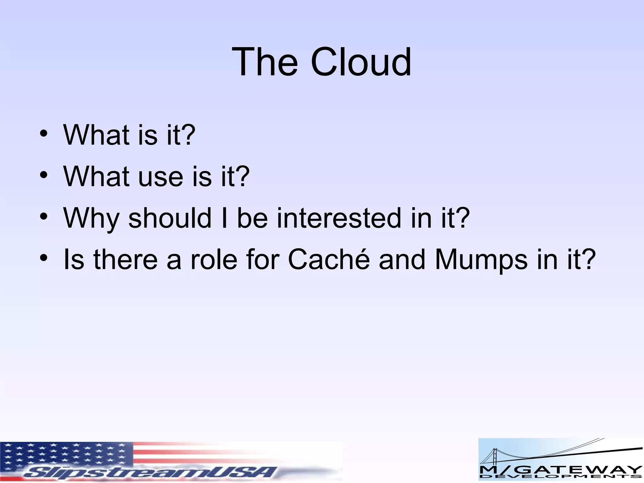 The document discusses cloud computing and its benefits, such as scalability, low upfront costs, and pay-as-you-go models. It outlines various cloud services provided by major players like Amazon Web Services, Microsoft Azure, and Google. The document also argues that Caché and Mumps databases are well-suited for cloud-based applications and services due to their ability to scale, high performance, and support for web services.