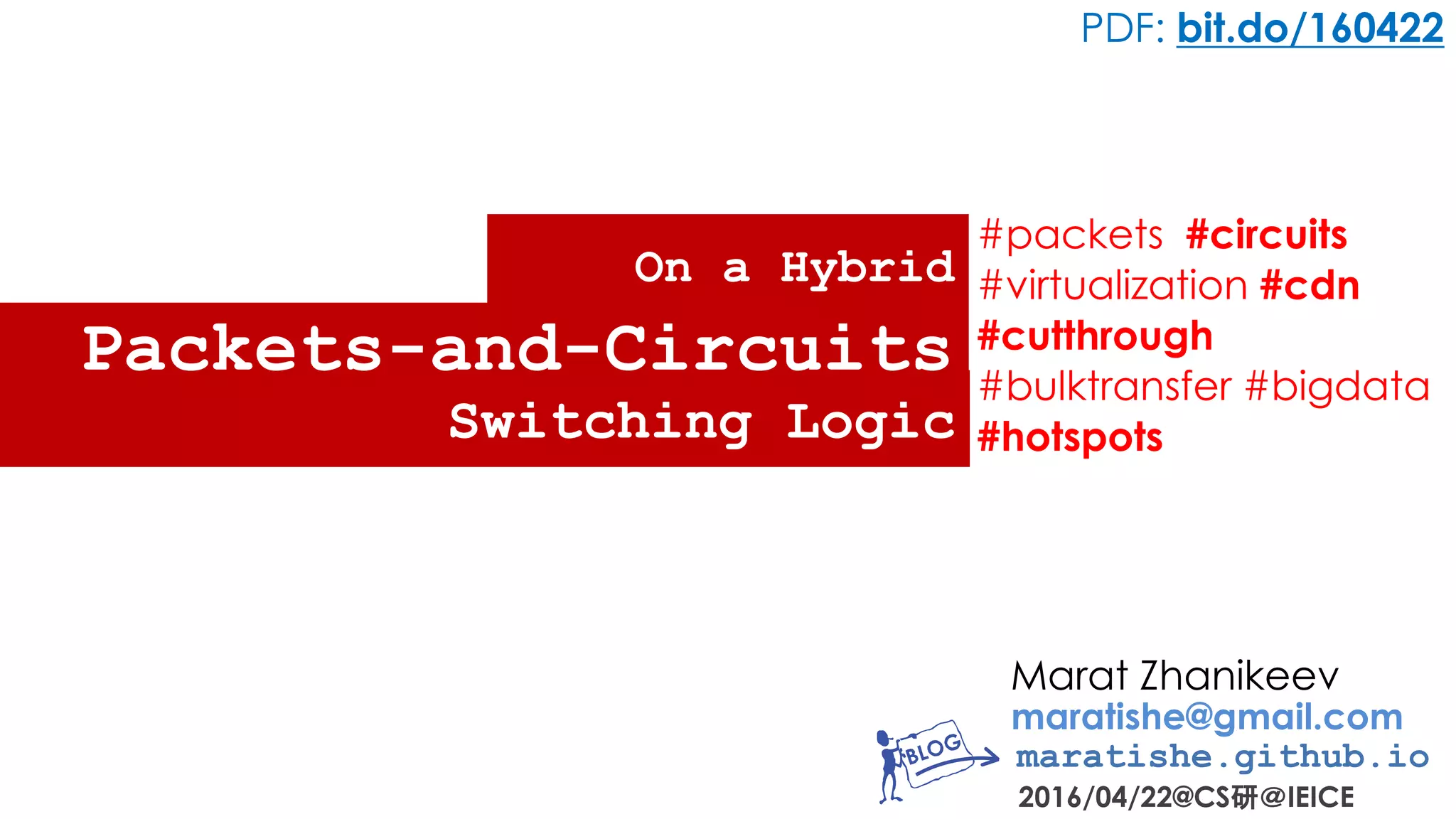 The document discusses a hybrid packets-and-circuits switching logic developed by Marat Zhanikeev, focusing on performance metrics such as overhead, traffic handling, and circuit management. It includes experimental setups utilizing high-speed rates and synthetic switching logic to evaluate packet and circuit performance. The findings suggest potential advantages in managing bulk and big data transfers in modern networks.