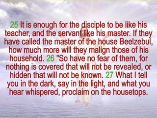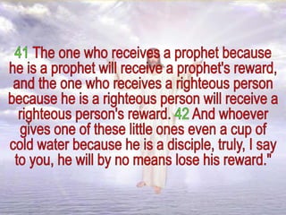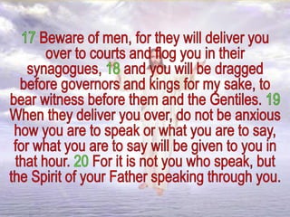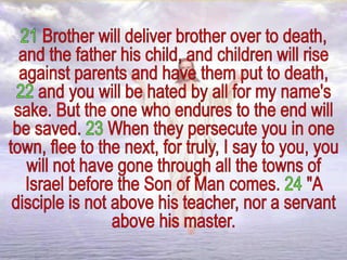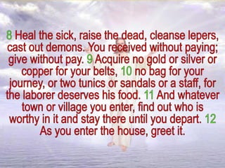 The document discusses the concept of mission in a Christian context, emphasizing the importance of preaching the gospel and healing. It highlights that every believer has a responsibility to share the message of Jesus Christ and face potential rejection and opposition. The author argues that despite challenges, commitment to the mission will lead to significant spiritual impact and eternal rewards.