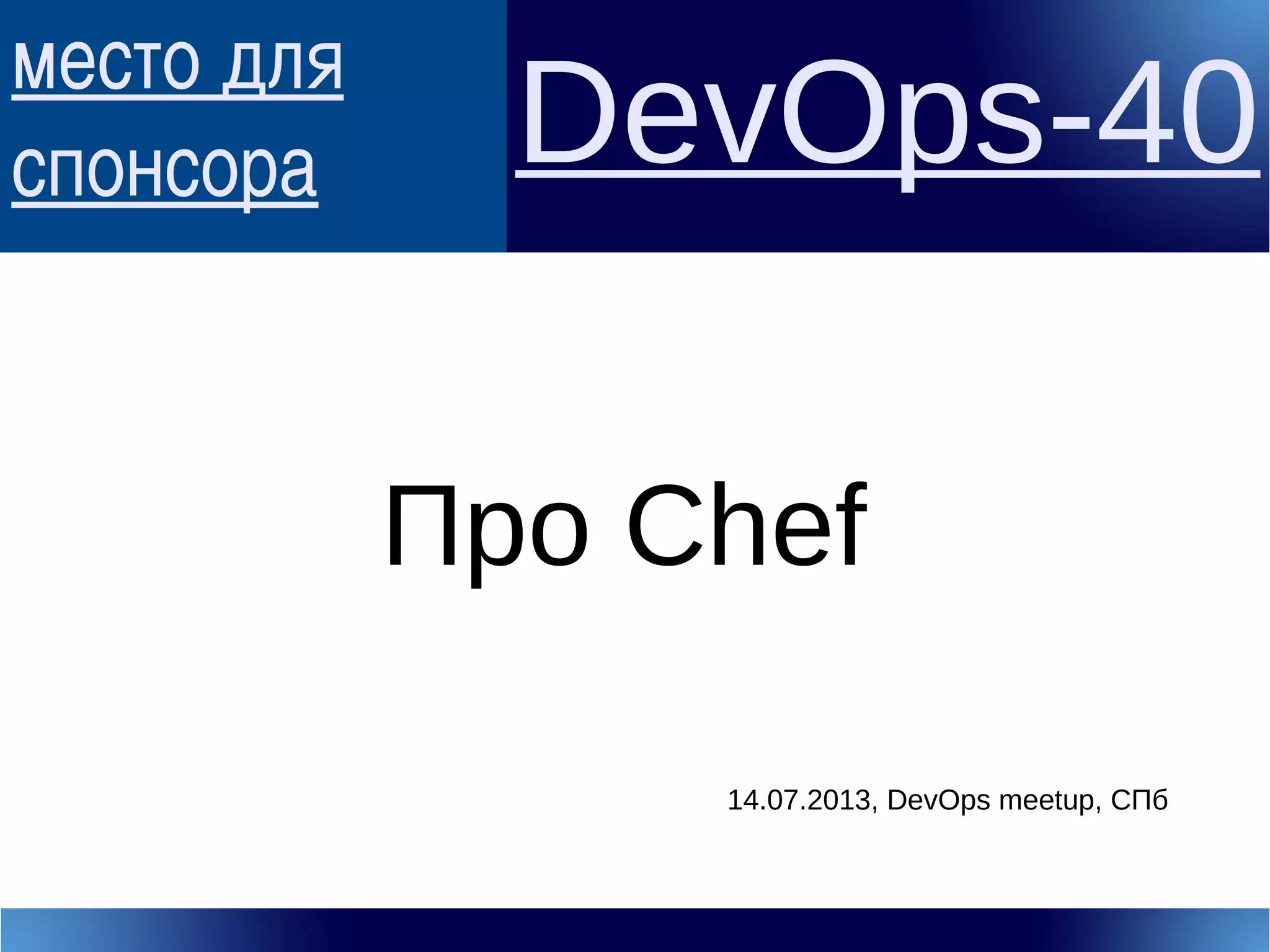Документ представляет собой обсуждение возможностей и проблем системы управления конфигурациями Chef, представленной на встрече DevOps в Санкт-Петербурге. Основные темы включают автоматизацию, конфигурацию как код, выбор языка и альтернативных инструментов, а также опыт использования Chef в больших проектах. Говорится о преимуществах и недостатках Chef, включая его популярность и проблемы с производительностью.