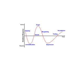 The document discusses the five stages of grief as proposed by Elisabeth Kübler-Ross: denial, anger, bargaining, depression, and acceptance. It examines each stage in depth, exploring how one transitions between stages and questioning whether there is truly a linear progression. While the five stages model provides a framework, the document notes that individual experiences with grief can vary greatly and not everyone will precisely experience the stages in the defined order.