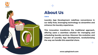 The document discusses the evolution of laundry app development, emphasizing its role in enhancing convenience and efficiency in managing laundry services. Key features include real-time tracking, eco-friendly practices, and user-friendly design, with a future focus on integrating AI for improved scheduling and personalized services. Uplogic Technologies positions itself as a leader in this innovative space, offering solutions that cater to modern consumer needs.