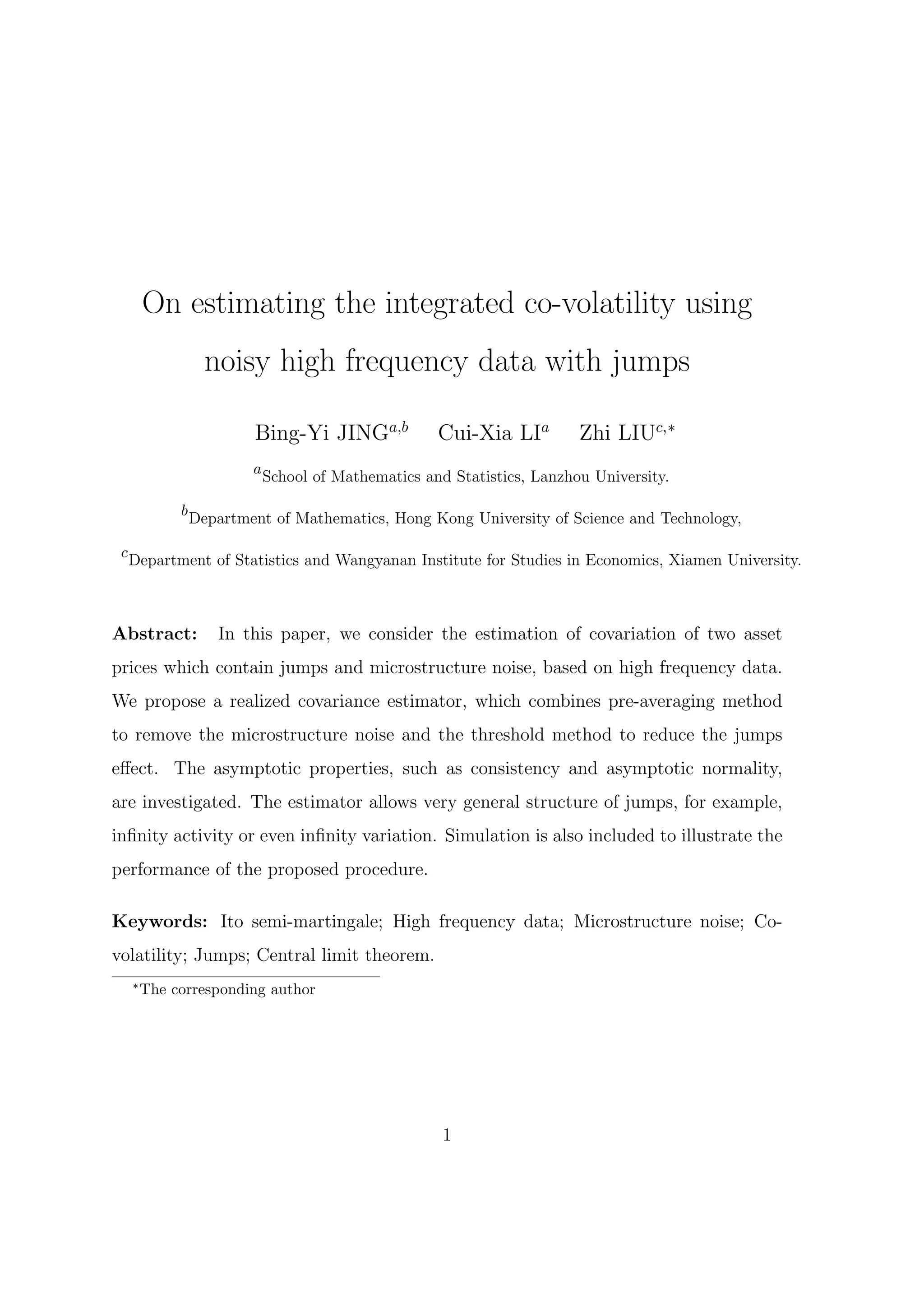 This document proposes a method to estimate the integrated co-volatility of two asset prices using high-frequency data that contains both microstructure noise and jumps.