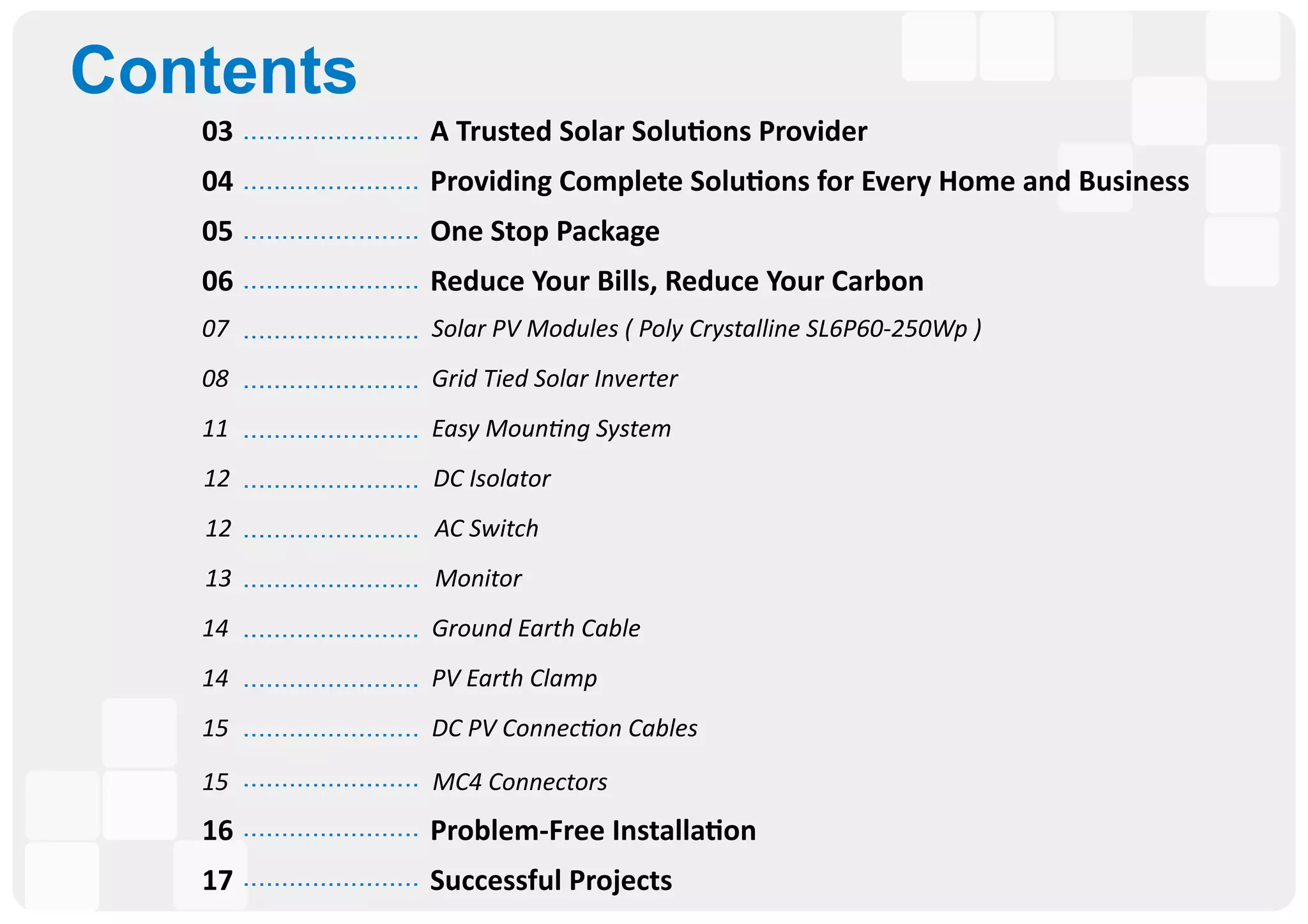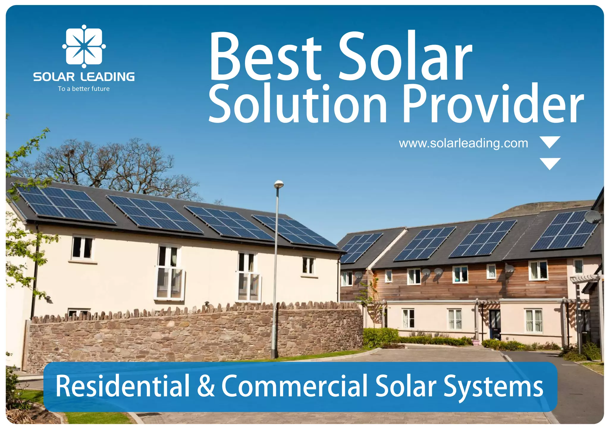 The document provides information about Solar Leading, a solar solutions provider. It discusses Solar Leading's history and production capacity. It also provides details about the components and services provided for residential and commercial solar installation projects, including modules, inverters, mounting systems, monitoring equipment, and installation services.