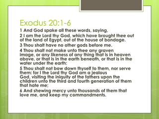 The document is a sermon about idolatry based on Exodus 20:1-6. It discusses how idol worship involves making, selling, buying, or bowing before graven images. Idol worship is defined as hating God and sin. The sermon warns that God is a jealous God who will punish idolatry for generations, but shows mercy to those who love and obey Him by acknowledging Him as their redeemer and savior from sin.