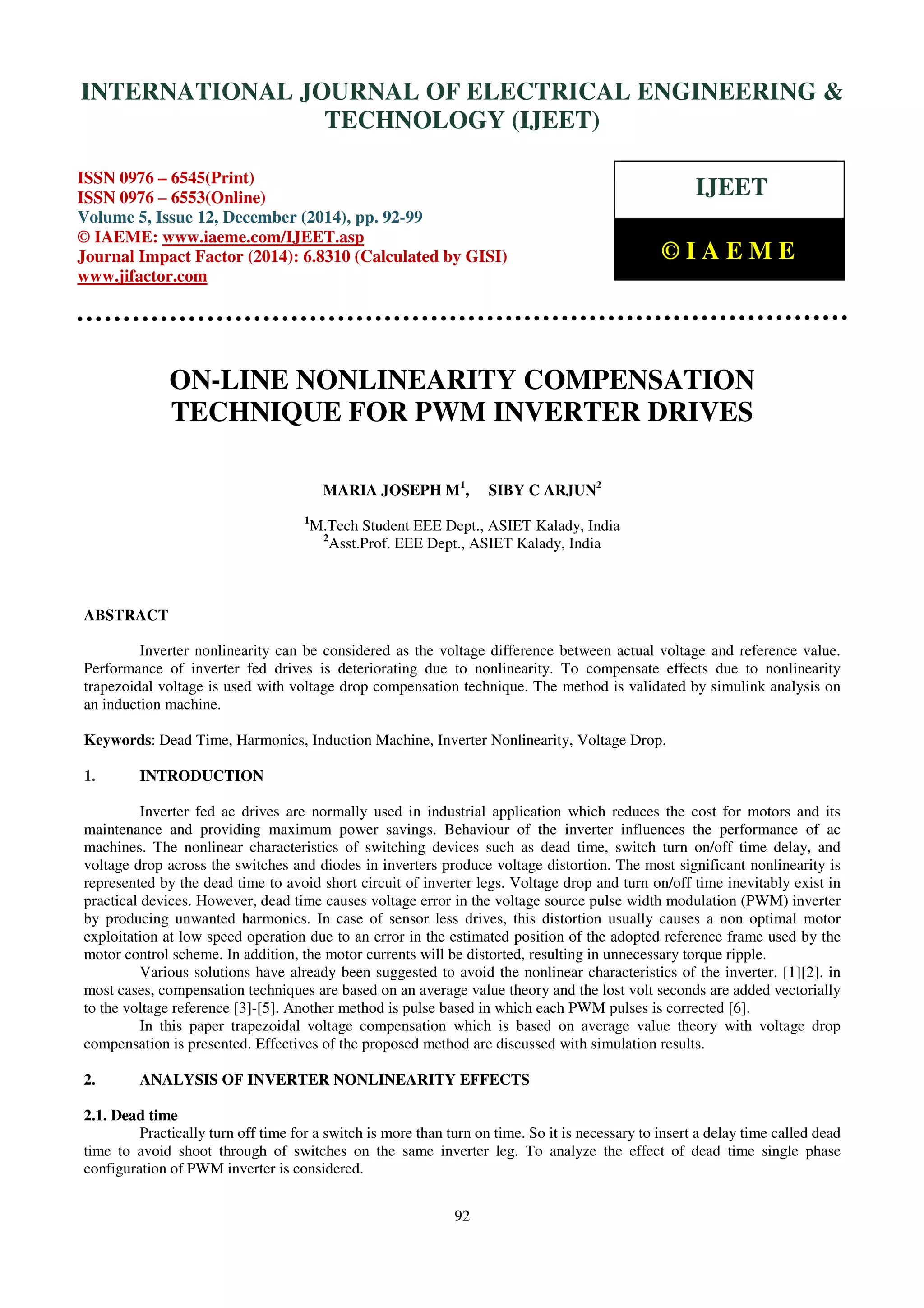 This document summarizes an online nonlinearity compensation technique for PWM inverter drives. Inverter nonlinearity arises from voltage distortions due to dead time, voltage drop across switches, and turn on/off delays. This nonlinearity deteriorates drive performance and causes torque ripple. The proposed method uses trapezoidal voltage compensation based on average value theory with voltage drop compensation. A compensation voltage is added to the reference voltage to account for inverter nonlinearity. The technique is validated through simulation of an induction machine drive. Adjusting the trapezoidal compensation voltage angle can modulate low-order harmonics to adapt to varying operating conditions.
