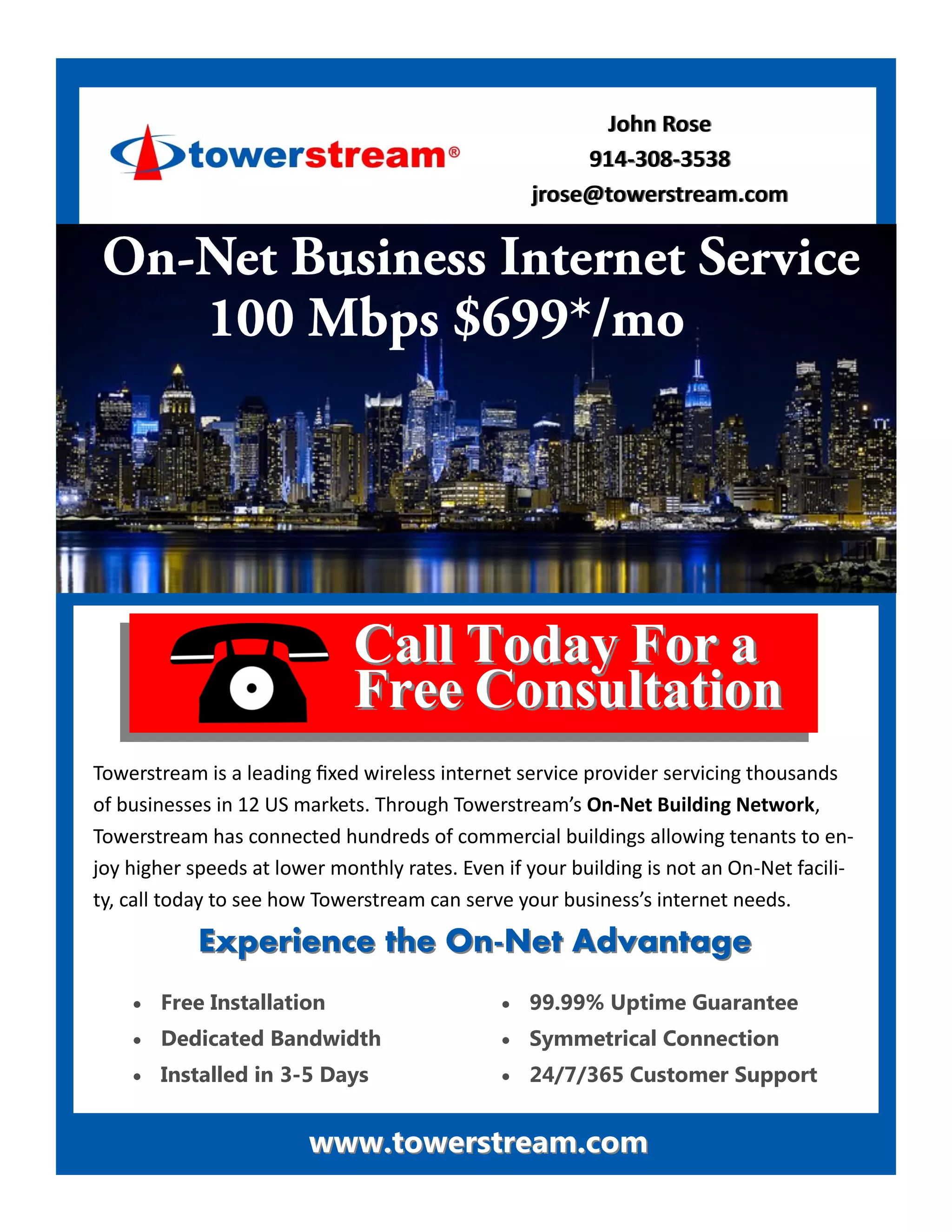 Towerstream is a leading fixed wireless internet service provider that services thousands of businesses across 12 US markets. They have connected hundreds of commercial buildings to their On-Net Building Network, allowing tenants to enjoy higher speeds at lower monthly rates. Even if a business's building is not On-Net, Towerstream can still serve their internet needs, and potential customers are encouraged to contact Towerstream for a free consultation.