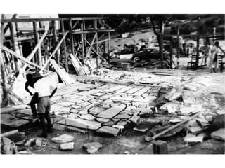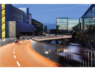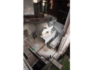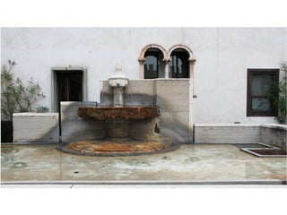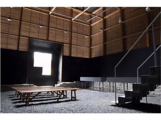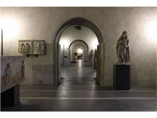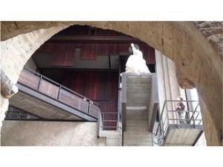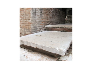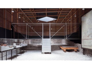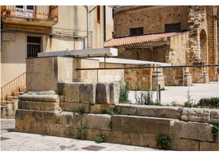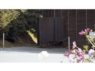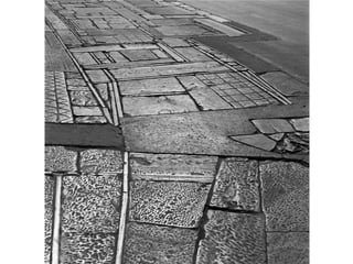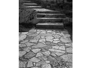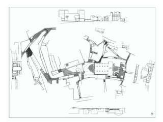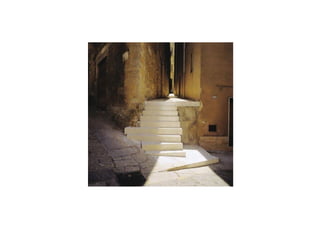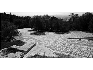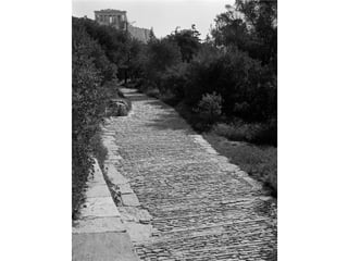 The document discusses various architectural and landscaping projects, highlighting the work of Dimitris Pikionis on the Acropolis of Athens, emphasizing the intentional integration of landscape features with pathways. It also mentions projects by notable architects such as Carlo Scarpa and Peter Zumthor, illustrating their approach to creating spaces that harmonize with historical and natural contexts. The overall theme reflects on how design influences the perception of space and time in urban environments.