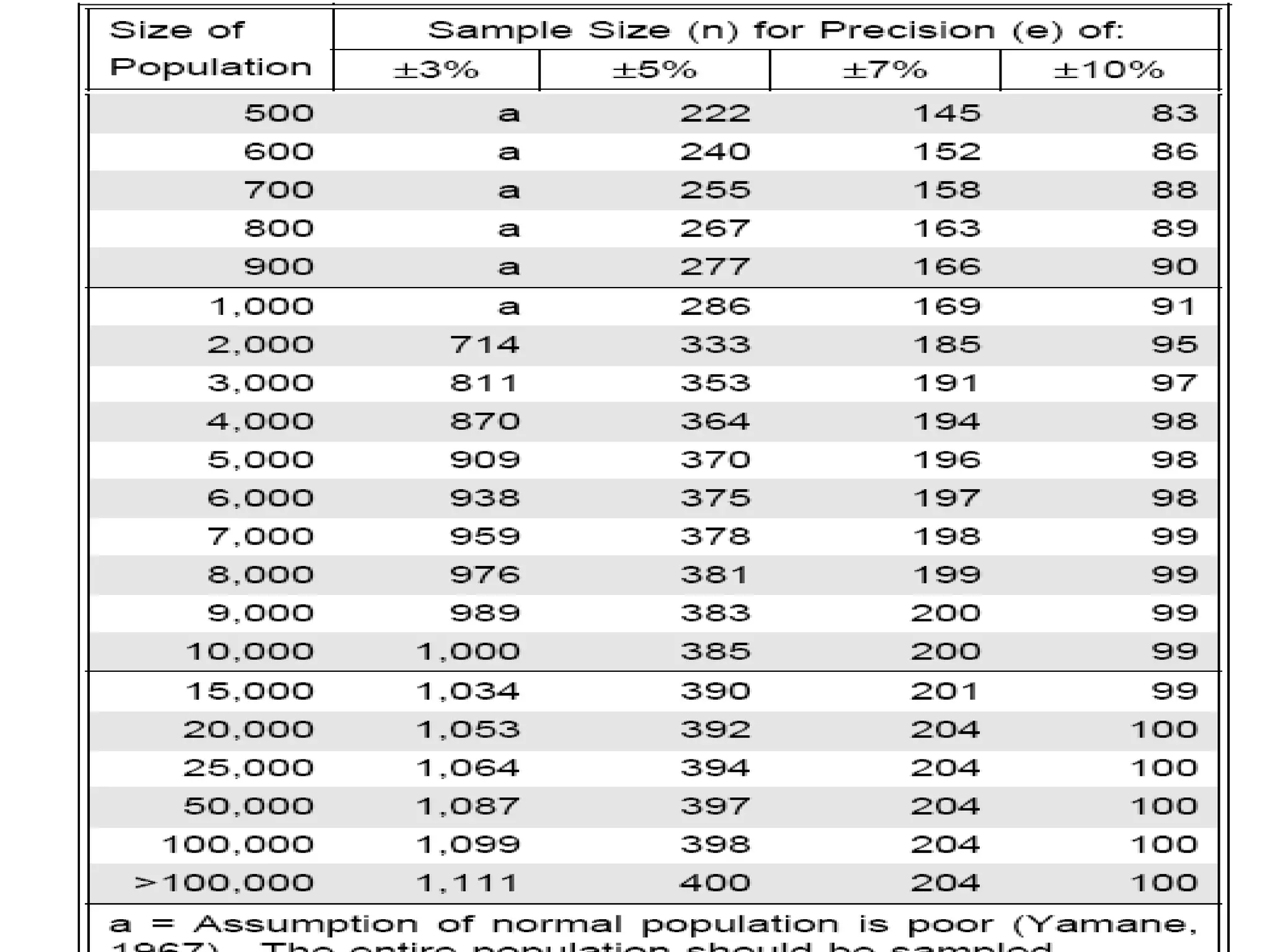 EXAMPLE: Sample Size Calculation Where  n = Sample size N = Population size e = Level of precision or Sampling of Error  which is  ± 5% Yamane’s formula: * Reference:  Yamane, Taro. 1967. Statistics, An Introductory Analysis,2 nd  Ed. New York: Harper and Row.
