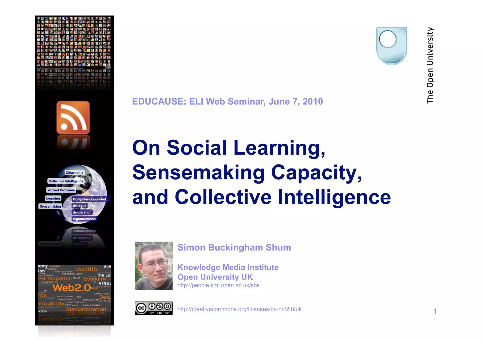 This document summarizes a web seminar on social learning, sensemaking capacity, and collective intelligence given by Simon Buckingham Shum. It discusses concepts like wicked problems, collective intelligence, and sensemaking. It also covers computer-supported approaches to participatory inquiry, dialogue, deliberation and argumentation. Transitional thinkers from the past like Makiguchi, Steiner, Montessori and Dewey are discussed as being needed for times of transition. The importance of developing skills like critical thinking, problem solving, collaboration and learning to learn are emphasized. Citizenship education, social learning technologies, and tools to support sensemaking like annotation, argument mapping and visualizations are presented.