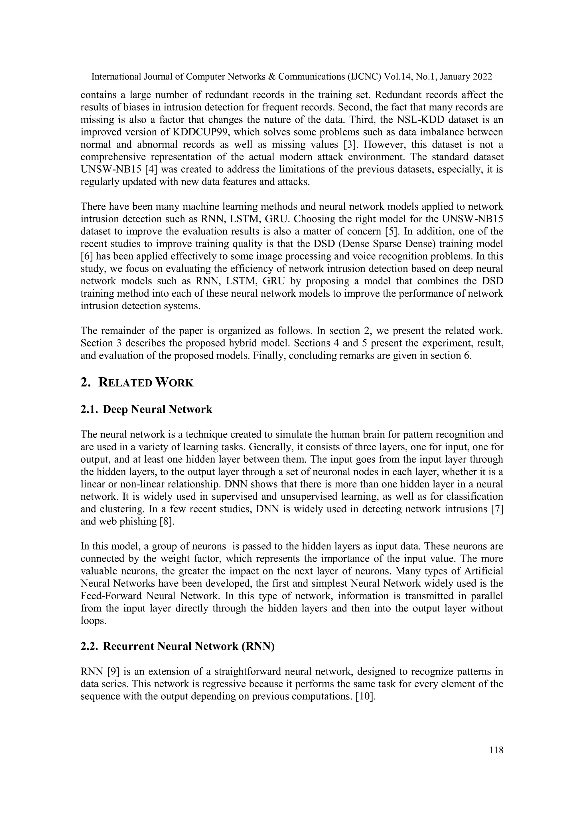 This study focuses on enhancing the performance of intrusion detection systems (IDS) by proposing a hybrid model that combines multilayer neural networks with a dense-sparse-dense (DSD) training methodology using the UNSW-NB15 dataset. Various neural network architectures, including RNN, LSTM, and GRU, were evaluated to improve metrics such as accuracy and detection rates while addressing challenges posed by malware's increasing sophistication. The paper outlines the structure and implementation of the proposed hybrid model and discusses the training procedures, ultimately aiming for more accurate detection of network intrusions.