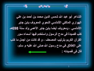 القصيدة تحكي عن مدح الرسول محمد صلى الله عليه وسلم بأسلوب أدبي مميز، حيث استخدم الشاعر ابن جابر الأندلسي أسماء سور القرآن الكريم في نصه. تمجيد الشاعر يبرز أهمية الرسول ودوره العظيم في دعوة الناس ونشر النور والهداية. القصيدة تعتبر من أجمل الأعمال في المدح وتعبّر عن تواصل المحبة والاحترام للرسول عبر العصور.