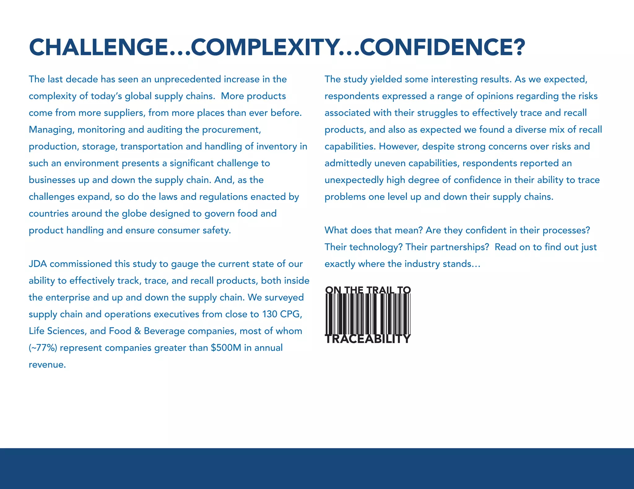 The document discusses the results of a survey about traceability challenges in supply chains. It finds that while many executives express confidence in being able to trace problems up and down the supply chain, nearly half of respondents said it would take days or weeks to execute a recall. Automation of trace processes is limited, and concerns around risks, costs, and regulatory compliance remain high. However, opportunities exist to improve traceability through technology upgrades and gain consumer loyalty by responsibly handling recalls.