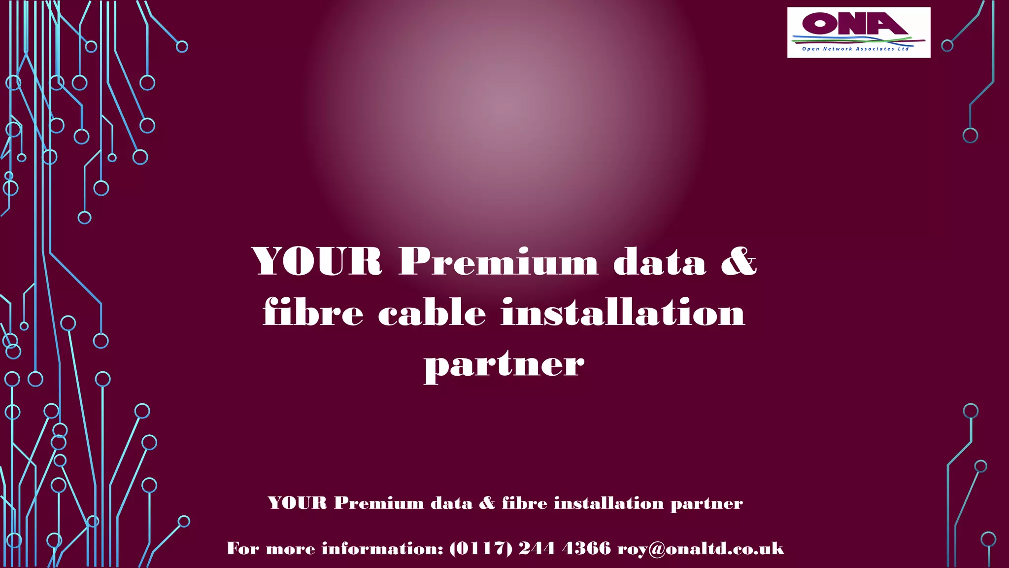 ONA is a premium data and fiber cable installation partner based in Bristol, England. They have over 20 years of experience installing high quality cabling for networks. Their services include Cat5, Cat5e, and Cat6 installation, cabinet installation and replacement, end user termination, and audio visual installation and supply. They serve both end users and IT specialists across sectors such as defense, finance, education, and facilities management.