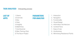 The document analyzes the onboarding processes of various apps including Asana, Evernote, Box, Quip, Insightly, MailChimp, CamScanner, Nike Training Club and The Noun Project. It evaluates each app based on parameters like interaction, navigation, visual design, functionality, ease of use and more. Best practices for onboarding identified include engaging users before asking for commitments, providing multiple login options, giving instructions to avoid errors, preparing users with important features, keeping content minimalistic and treating all users equally.