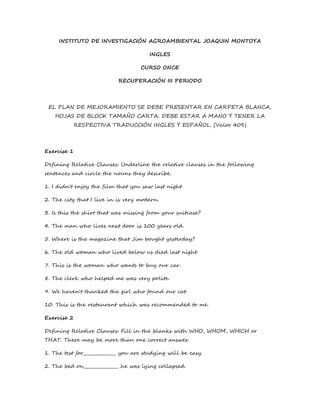 The document provides instructions for a recovery plan assignment for an English course. Students must submit their recovery plan in a white folder with letter sized paper. The plan must be handwritten and include an English and Spanish translation. The assignment is worth 40% of the student's grade.