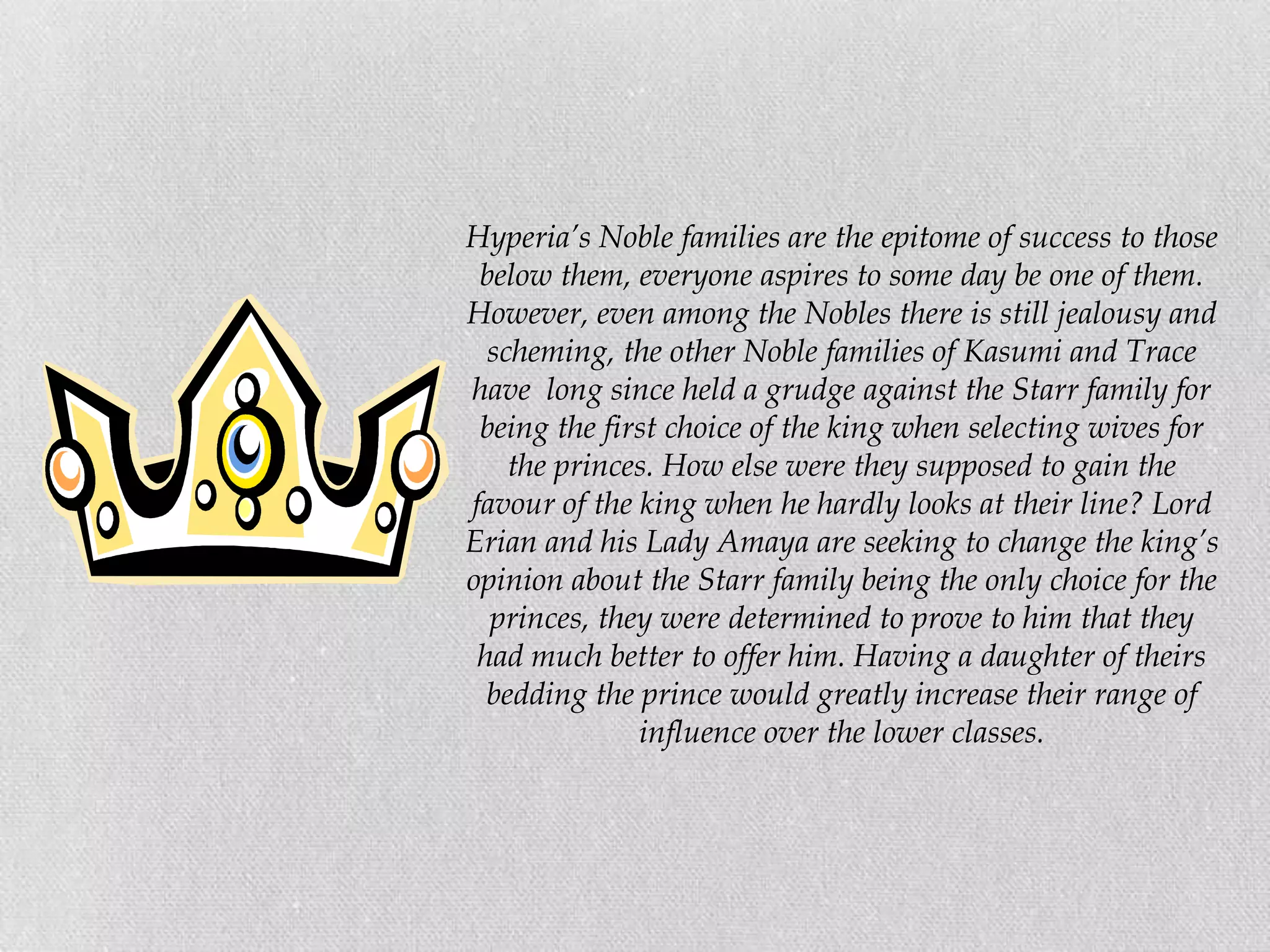 Lord Erian of the Kasumi family is scheming to have his daughter Hinamori marry Prince Derek and become queen. He is working to become mayor to gain influence over the king. Lady Amaya gives birth to twins Hinamori and Shuuhei. Lord Thai of the Trace family takes a consort, Lady Maia, but secretly takes many lovers. Lady Maia gives birth to a daughter, Kindle. The four noble families establish themselves in the new kingdom.