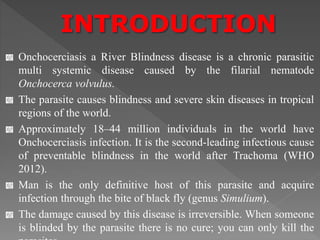 Onchocerciasis, caused by the parasite Onchocerca volvulus, is a chronic disease resulting in blindness and severe skin conditions, with Nigeria being the most endemic country. An estimated 7-10 million Nigerians are infected, primarily affecting individuals aged 20-30 years, and the disease is transmitted through bites from the black fly, which breeds in fast-flowing water. While ivermectin can kill microfilariae, there is no cure for blindness caused by the disease, necessitating increased awareness and community treatment efforts.