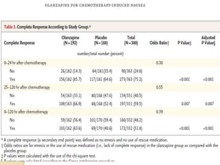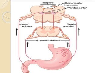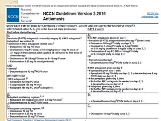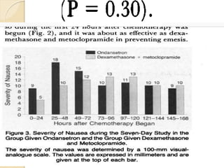 This document outlines chemotherapy-induced nausea and vomiting (CINV), including its types, pathophysiology, predictive factors, and prevention/treatment approaches. There are three types of CINV - acute, delayed, and anticipatory. The pathophysiology involves the central nervous system and neurotransmitters like dopamine, serotonin, and substance P. Predictive factors include the chemotherapy agent/dose, patient characteristics, and antiemetic regimen. Prevention/treatment involves 5-HT3 receptor antagonists, neurokinin-1 receptor antagonists, glucocorticoids, and dopamine receptor antagonists. Combination therapy is most effective at preventing both acute and delayed CINV.