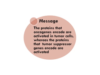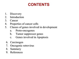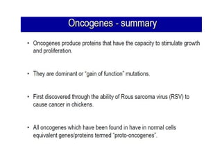 This document discusses oncogenes, which are genes that can cause cancer. It defines oncogenes as genes that were originally proto-oncogenes, which are normal genes involved in cell growth that become mutated and cause uncontrolled cell division. The document covers several topics related to oncogenes, including the classes of genes involved in cancer development (proto-oncogenes, tumor suppressor genes, apoptosis genes), the mechanisms by which proto-oncogenes become activated, the properties of cancer cells, and the role of carcinogens and oncogenic retroviruses in cancer development. It also provides examples of specific oncogenes and tumor suppressor genes.