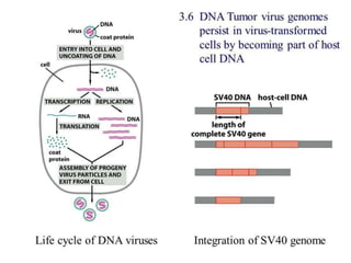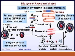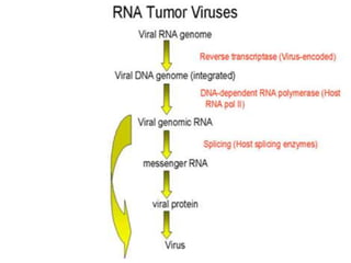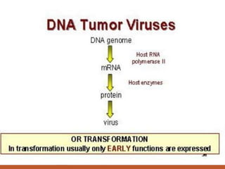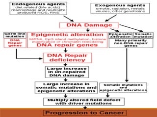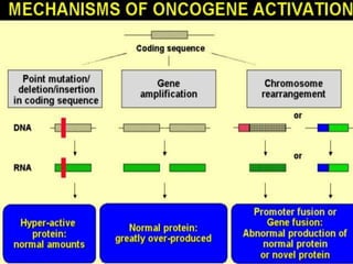 This document summarizes oncogenesis, the process by which normal cells are transformed into cancer cells. It discusses how proto-oncogenes can become activated oncogenes through mutations, increased expression, or chromosomal rearrangements. Oncogenes code for proteins involved in cell growth and division. The document also describes various causes of oncogenesis like genetic/epigenetic changes, DNA damage from endogenous or exogenous sources, field defects, and oncogenic viruses that activate proto-oncogenes or inactivate tumor suppressor genes. The mechanisms of viral oncogenesis and classification of viral oncogenes into growth factors, receptors, signal transducers and transcription factors are summarized as well.