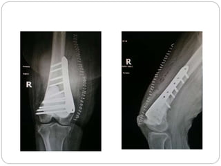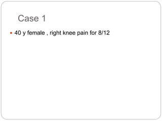 This document discusses 8 oncology cases. Case 1 involves a 40-year old female with right knee pain. Case 2 is a 28-year old male with a left subtrochantric fracture from a MVA who is now experiencing increasing left knee pain and swelling. Biopsy results showed high-grade osteosarcoma. Case 3 is a 30-year old female with breast cancer and bone metastases causing bilateral hip pain.