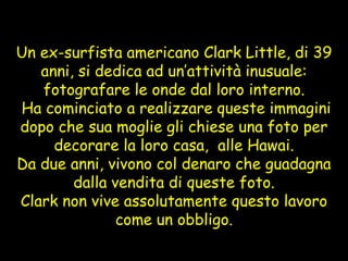 Clark Little, un ex-surfista americano, si specializza nella fotografia delle onde dall'interno, iniziando questa attività su richiesta della moglie. Da due anni vive grazie alle vendite delle sue foto, nonostante i rischi associati al fotografare onde alte fino a 4,5 metri. La sua esperienza nel surf lo aiuta a gestire le sfide legate a questo lavoro.