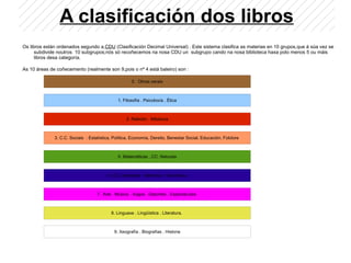 A clasificación doslibros Os libros están ordenados segundo a CDU (Clasificación Decimal Universal) . Este sistema clasifica as materias en 10 grupos,que á súa vez se subdivide noutros 10 subgrupos;nós só recoñecemos na nosa CDU un subgrupo cando na nosa biblioteca haxa polo menos 5 ou máis libros desa categoría.