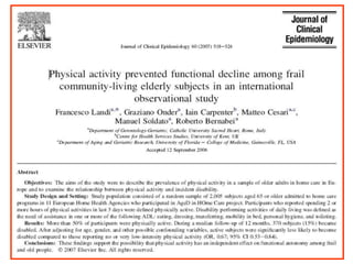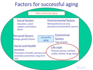 This document discusses the role of physical activity and exercise in aging populations. It covers factors for successful aging, characteristics of study populations according to physical activity levels, and the health benefits and goals of exercise for both younger-old and older-old age groups. The document also summarizes studies on the relationship between physical activity and reduced risks of mortality, cardiovascular disease, and other health outcomes. It provides guidelines for endurance and resistance training programs as well as screening recommendations for exercise in older adults.