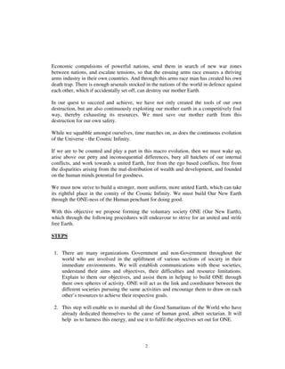 The document proposes forming a voluntary society called ONE to work towards building a united, strife-free Earth. It outlines steps for ONE to coordinate with existing organizations, inform governments and citizens, and establish local chapters to alleviate suffering and promote spiritual upliftment through non-sectarian teachings. The goal is for individuals to move beyond ego and work selflessly for human good, ensuring all people's basic needs are met on a sustainable planet.