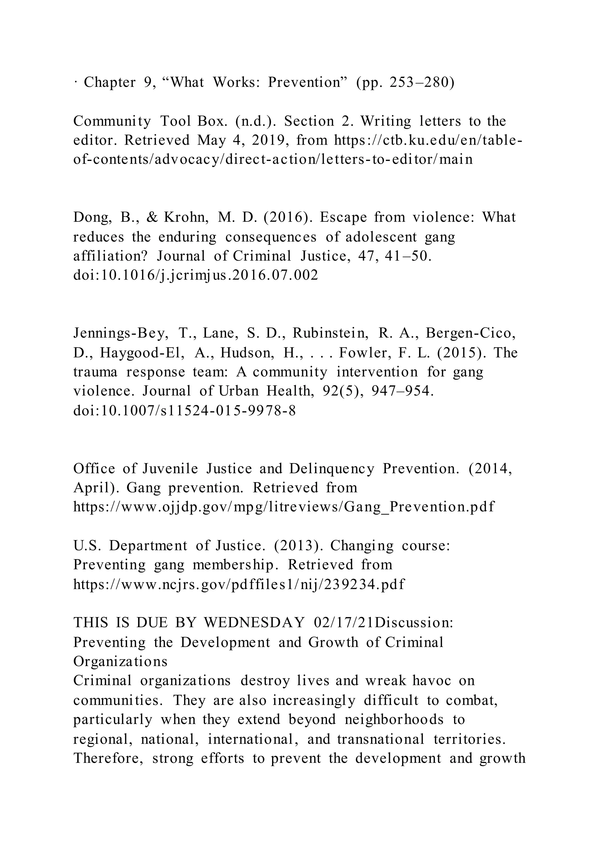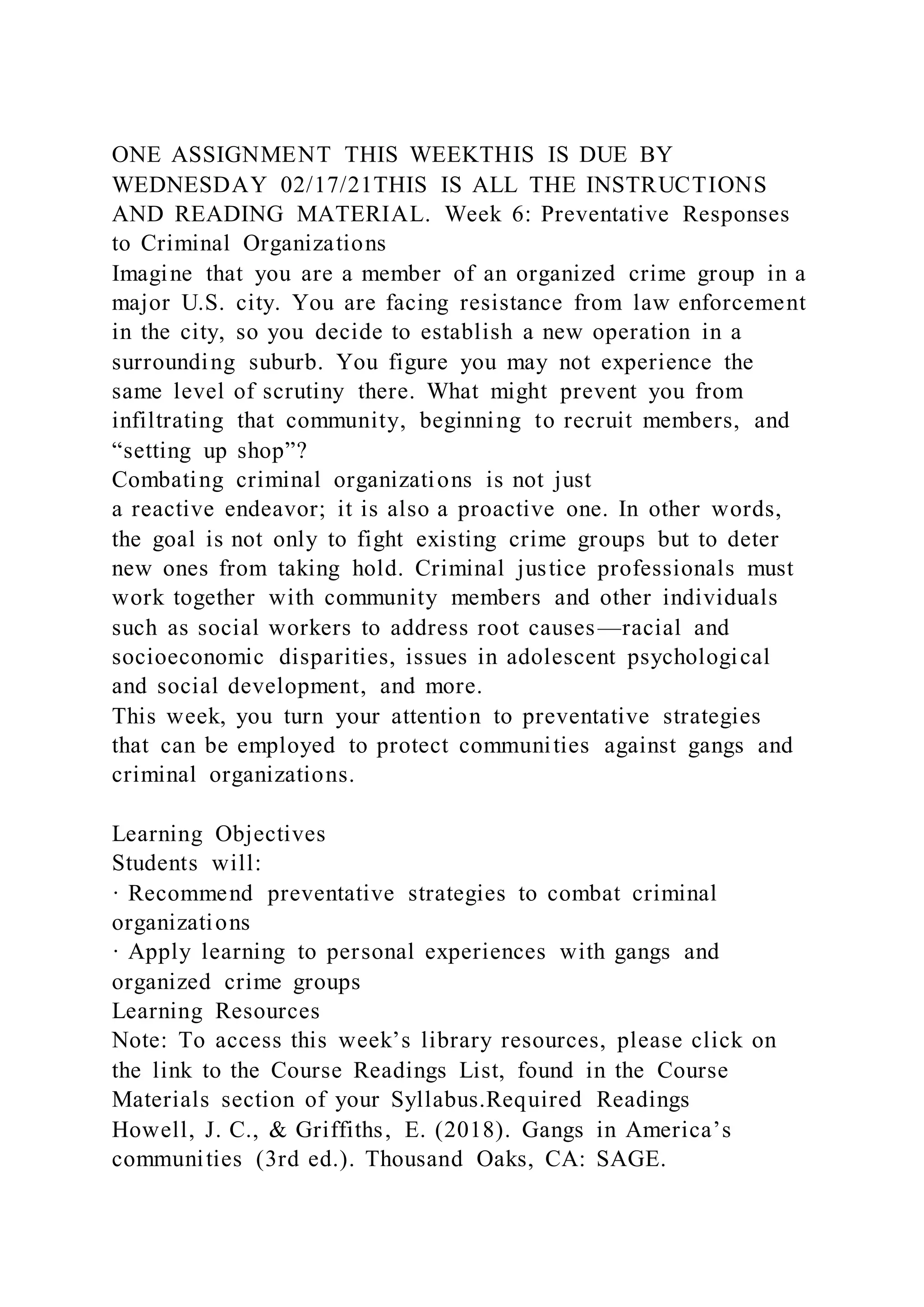 This document provides instructions for an assignment due on February 17th. It asks students to imagine they are part of an organized crime group looking to establish operations in a new suburb to avoid law enforcement scrutiny. Students are then instructed to recommend preventative strategies that could be used to protect communities against gangs and criminal organizations. The document provides learning objectives and required readings on preventative approaches. It outlines a discussion for students to write a letter to the editor of their local newspaper addressing what law enforcement should do to prevent new criminal groups, recommending an effective prevention strategy, and outlining how to prevent groups from taking root if their community has not been exposed to them.