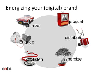The document provides tips for energizing a digital brand through distribution, listening, synergizing, optimizing, and engagement. It recommends using domain landing pages, search engine optimization, social media, measuring analytics, and call-to-action buttons to distribute content and engage audiences. The goal is to humanize the brand through fresh content and conversation on blogs, newsletters, and social media.