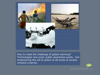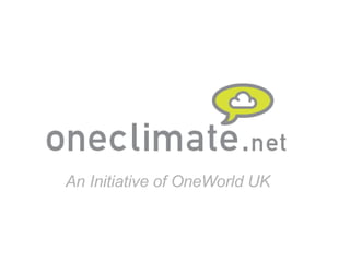 OneWorld UK is building a social networking site called OneClimate.net to encourage global action on climate change by mobilizing public support. OneClimate.net will provide online spaces for citizens and organizations to display their progress towards sustainability goals and reducing their carbon footprint through virtual tools and graphics. The site also aims to offer carbon-free alternatives for meetings and skills training through virtual spaces like simulations and interactive displays on OneClimate Islands in Second Life.