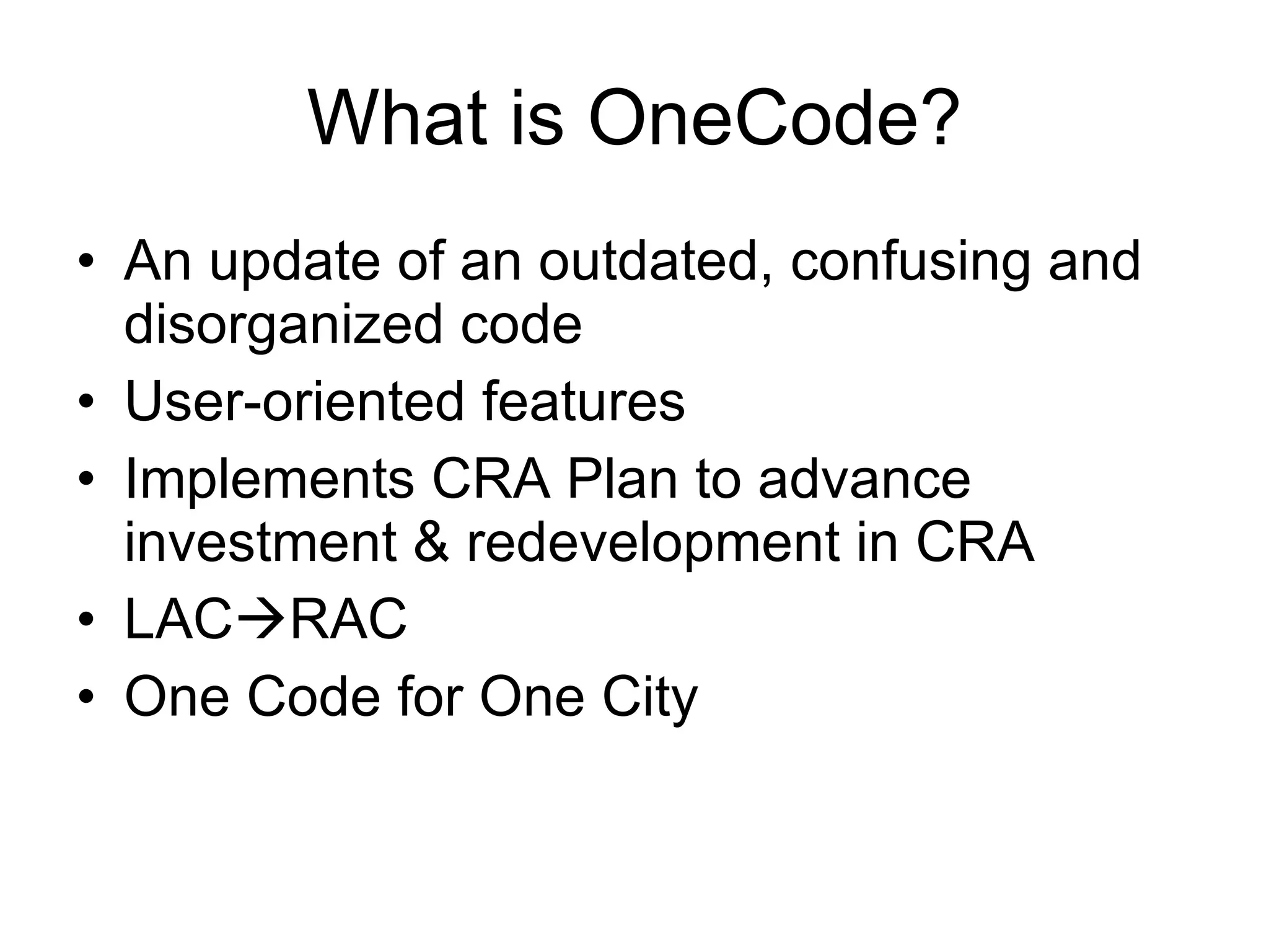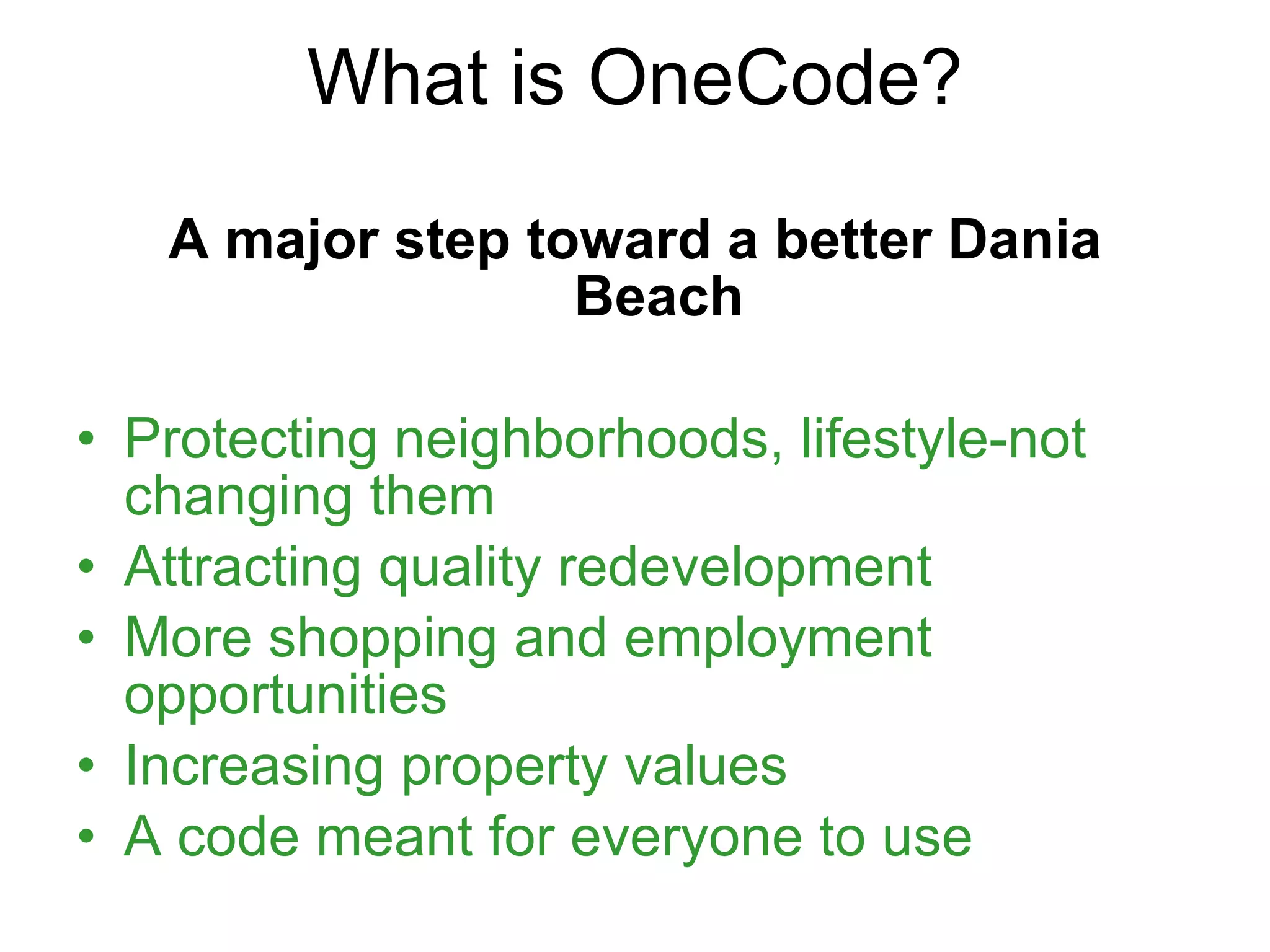 OneCode is an effort to consolidate Dania Beach's three separate zoning codes into a single unified code. It aims to make the code more user-friendly without changing residents' existing lifestyles or development potential. City staff hosted multiple community workshops to gather input on topics like boat lifts, sheds, fences, and vehicle parking. The proposed OneCode defines commercial vehicle regulations and allows limited parking of small commercial vehicles in residential areas.