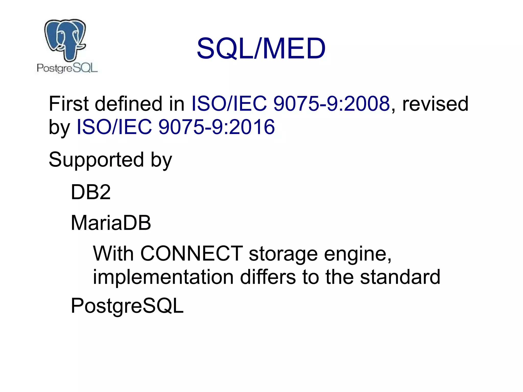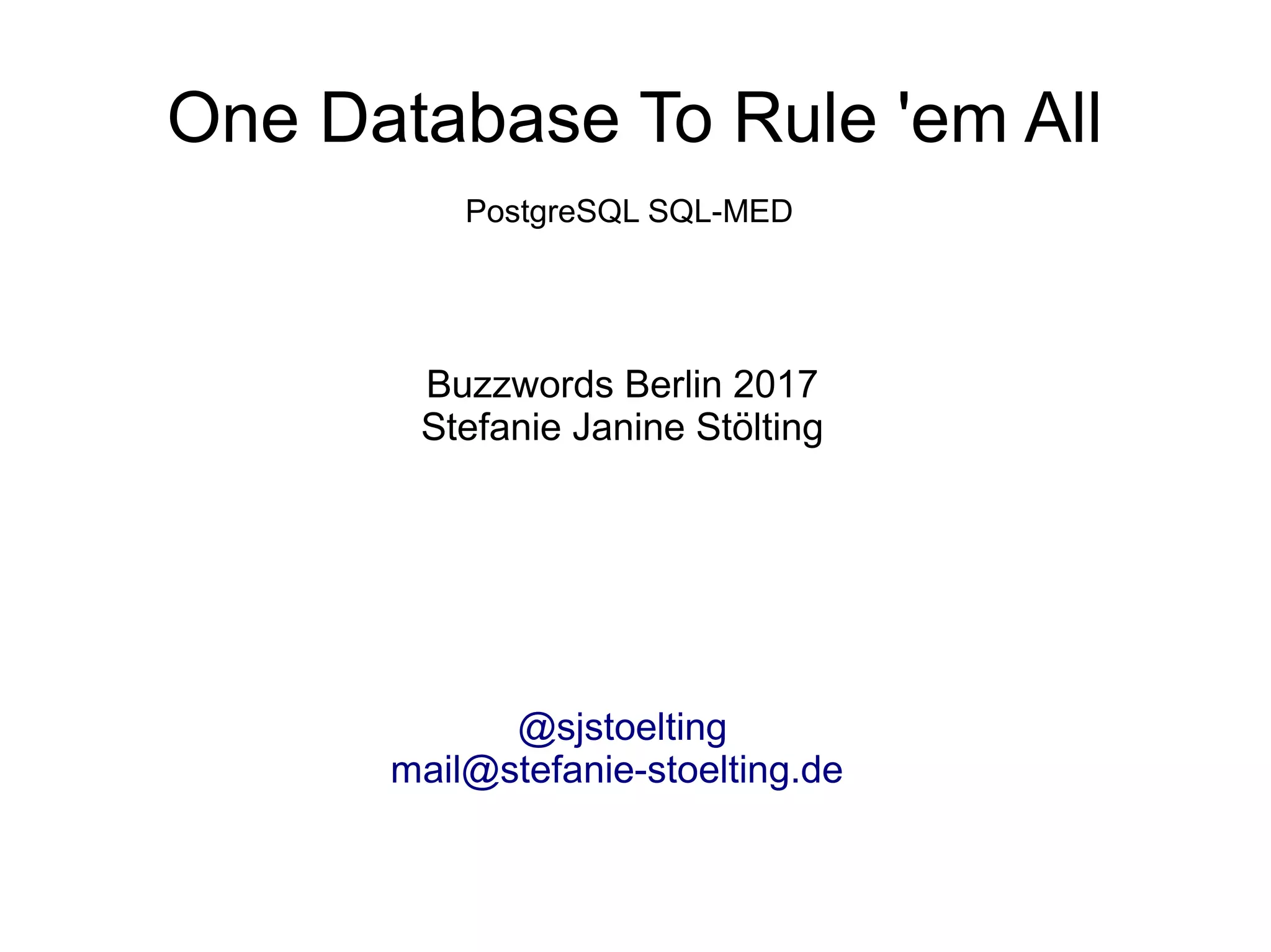 The document discusses various foreign data wrappers (FDWs) in PostgreSQL, including implementations for databases like SQLite, MySQL, and MariaDB, along with examples demonstrating live data interaction and queries. It showcases examples of creating foreign tables, executing joins across different databases, and utilizing extensions like Multicorn for accessing diverse data sources such as RSS feeds. The document concludes with practical use cases and links to additional resources on GitHub.