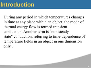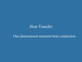 The document discusses one-dimensional transient heat conduction, focusing on time-dependent temperature changes within objects. It covers various scenarios such as lumped thermal capacity models, semi-infinite solids, cylinders, and slabs, with applications in heat exchangers and boiler tubes. Key concepts include uniform temperature distribution and cases where conduction heat resistance is negligible.