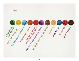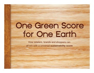 This document summarizes the origins of an idea to develop a universal sustainability scoring system. It began when the authors observed many retailers and brands promoting their sustainability efforts through various ratings and scores. They wanted to understand consumer wants regarding sustainable products and inspire stakeholders to collaborate on a shared definition of sustainability. The authors conducted research on consumer eco-consciousness and attitudes toward existing nutrition and sustainability standards. They launched their own study to provide guidance to brands on clearly communicating product sustainability in a unified way.