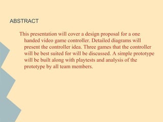 The document describes a group project to design a one-handed video game controller. It provides inspiration for the design from various existing controllers. It then shows the design process, which combined elements from each group member's inspiration. Schematic diagrams depict the final controller design, which includes buttons, joysticks, and other standard controller features configured for one-handed use. The document also lists assumptions made in the design process and provides descriptions of two games that would work well using the new controller.